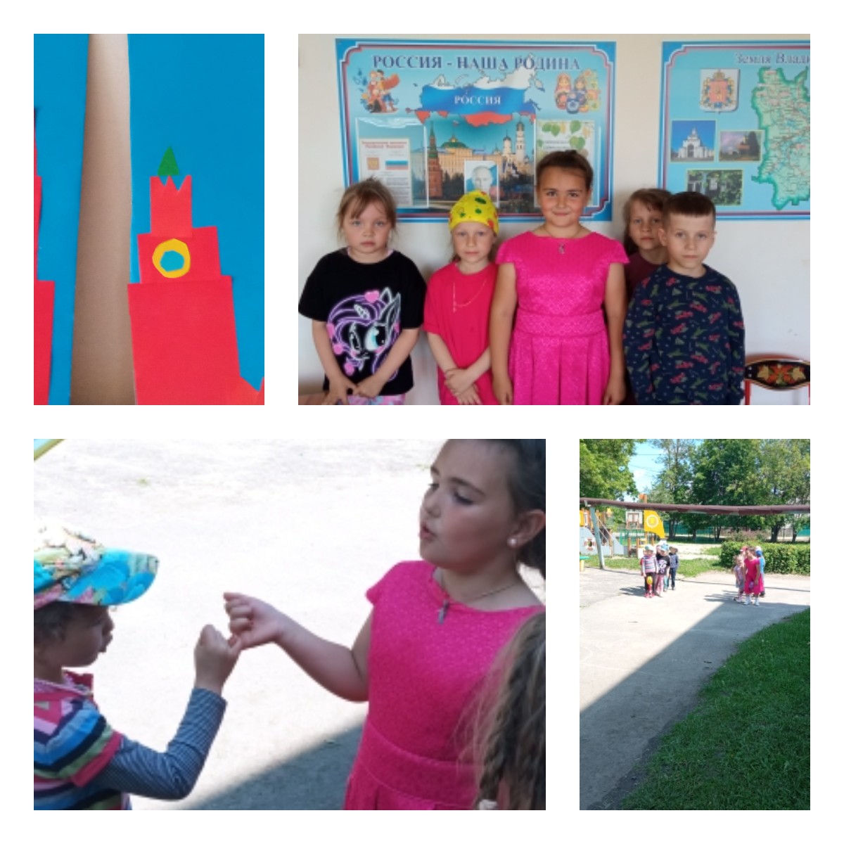 В группах воспитатели провели беседы «Наша Родина - Россия» с использованием презентации, викторины «Мы живем в России» и творческих занятий , закрепили знание символов государства – прослушали гимн России, рассказали про герб и флаг, исполнили русские хороводы и спели песни про Родину.