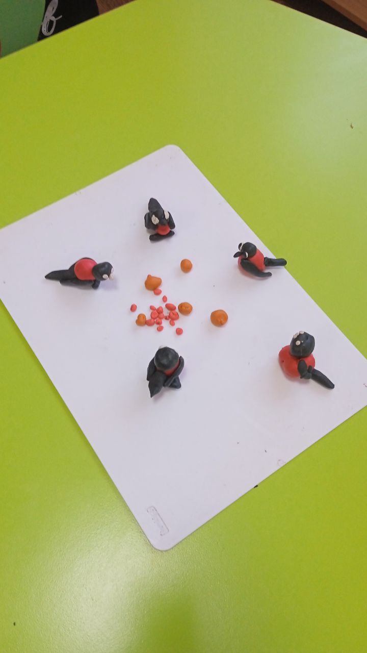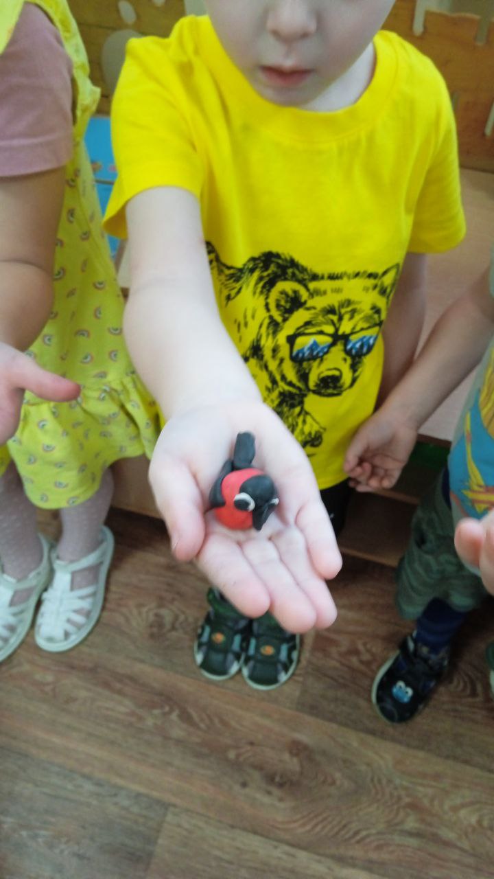 9 января - День снегиря. В детском саду "Колосок" дети рассматривали картинку со снегирём, лепили снегиря и крошечки для него, считали снегирей на веточке, прокладывали дорогу к кормушке. Во время прогулки положили в кормушку корм для этой красивой птички.