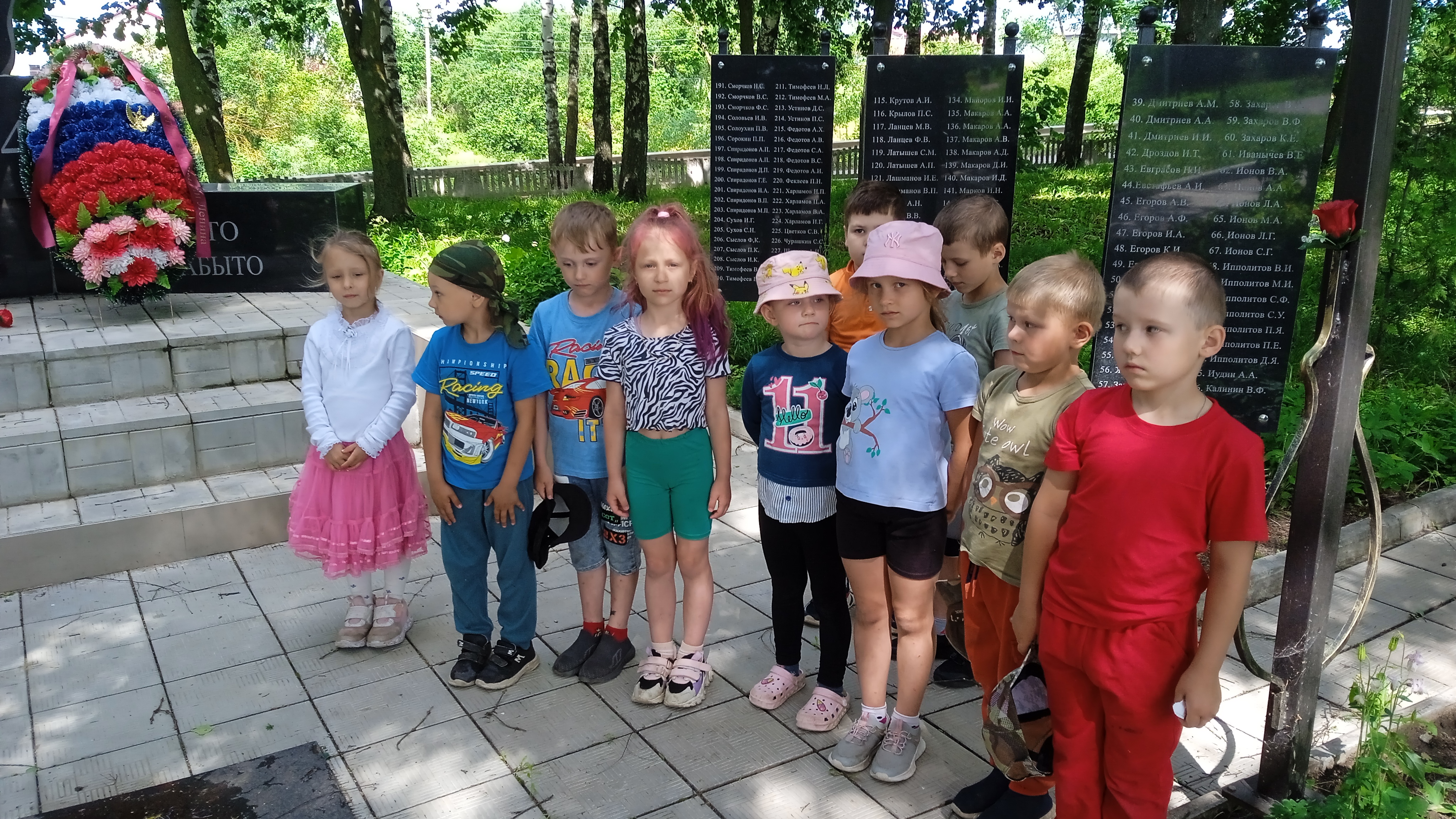 22 июня для детей старшей группы был проведён информационный час "Завтра была война". Дети отметили эту дату минутой молчания , слушали знаменитую песню "Вставай, страна огромная!", рассматривали репродукции начала Великой Отечественной войны. А также посетили мемориальный памятник, отдали дань памяти темкто погиб в это трагическое время