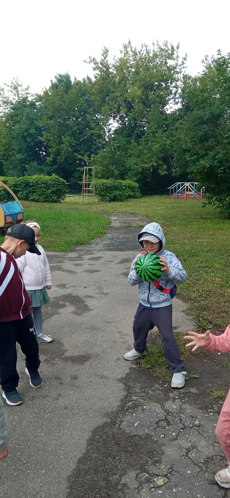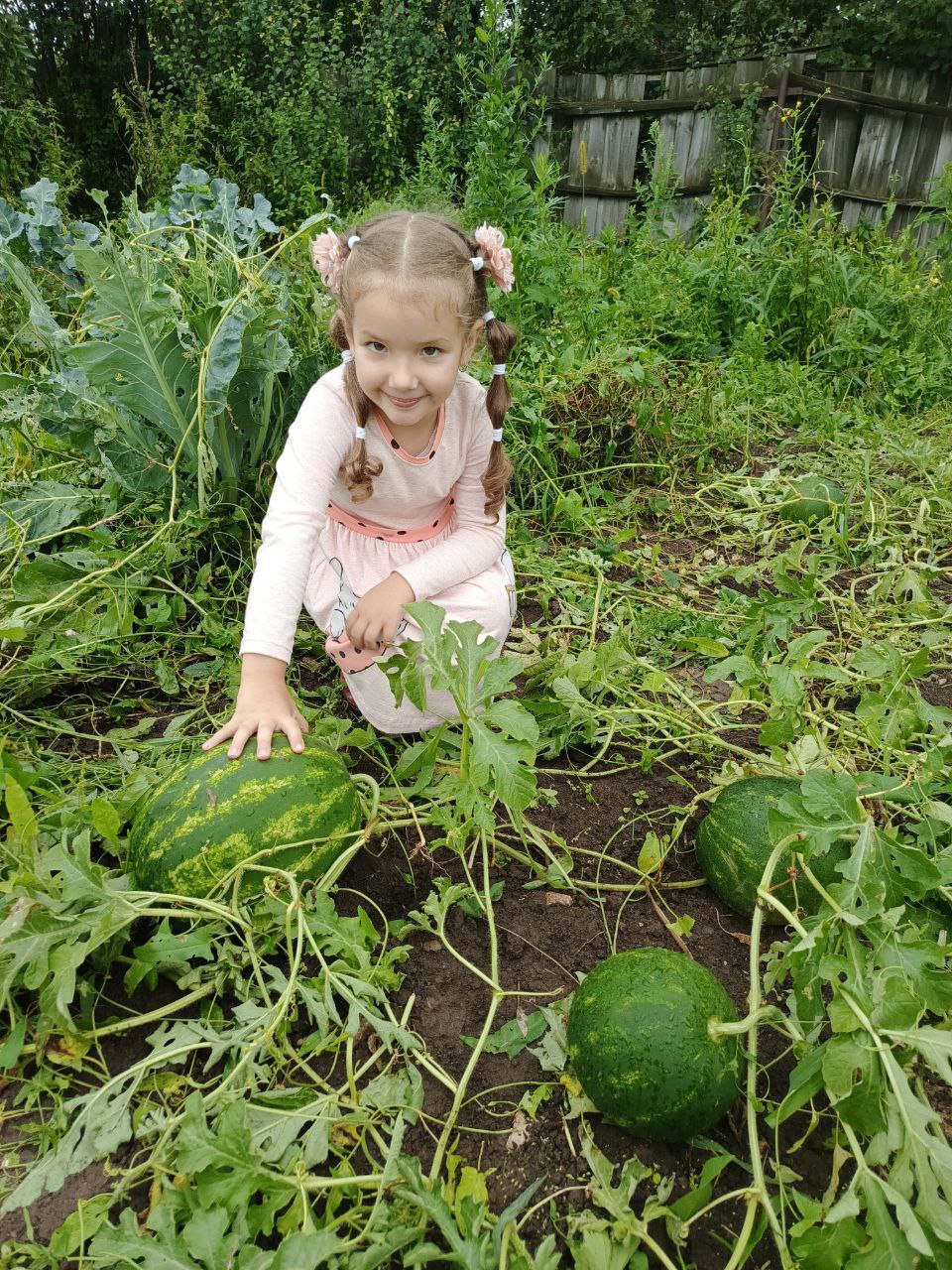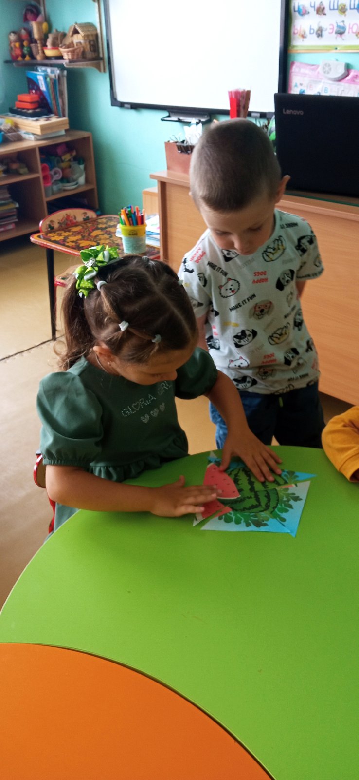 Мы играли в подвижные игры с мячиком в виде арбуза, рисовали арбузы на выставку, собирали разрезные картинки, а родители поделились фотографиями с урожаем арбузов на своих грядках.