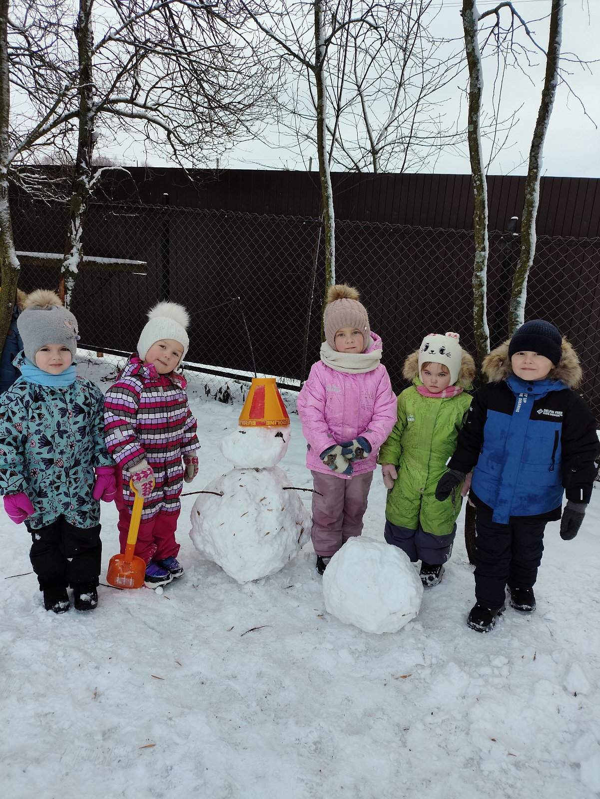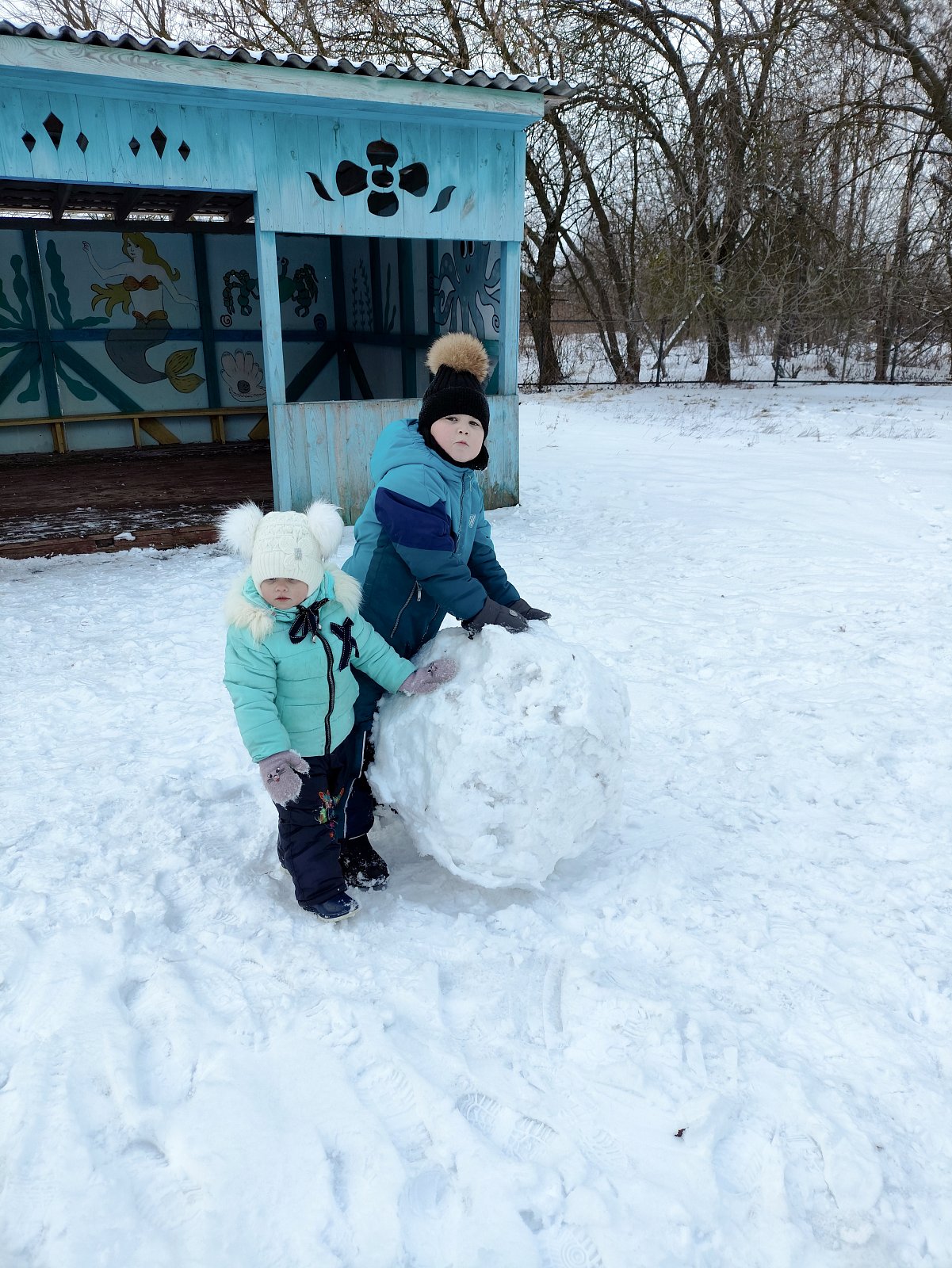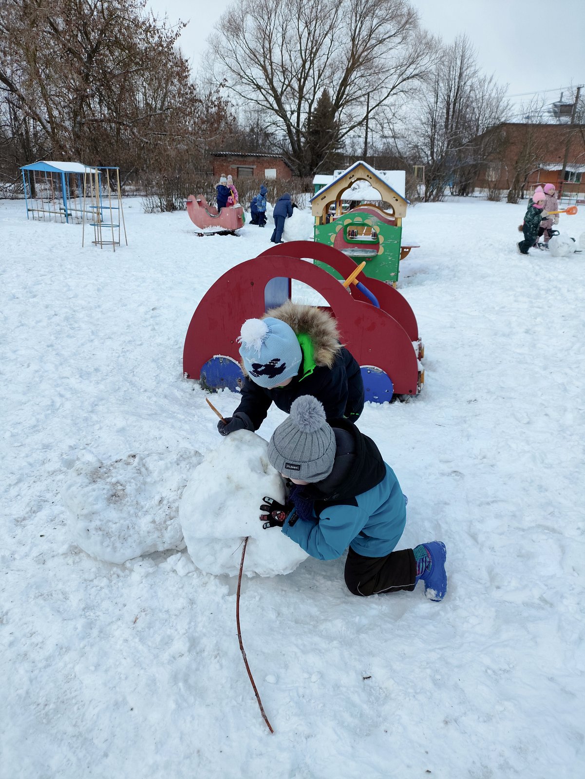 А у нас в этом году снега как-то маловато. Но мы всё-таки сумели слепить снеговика.